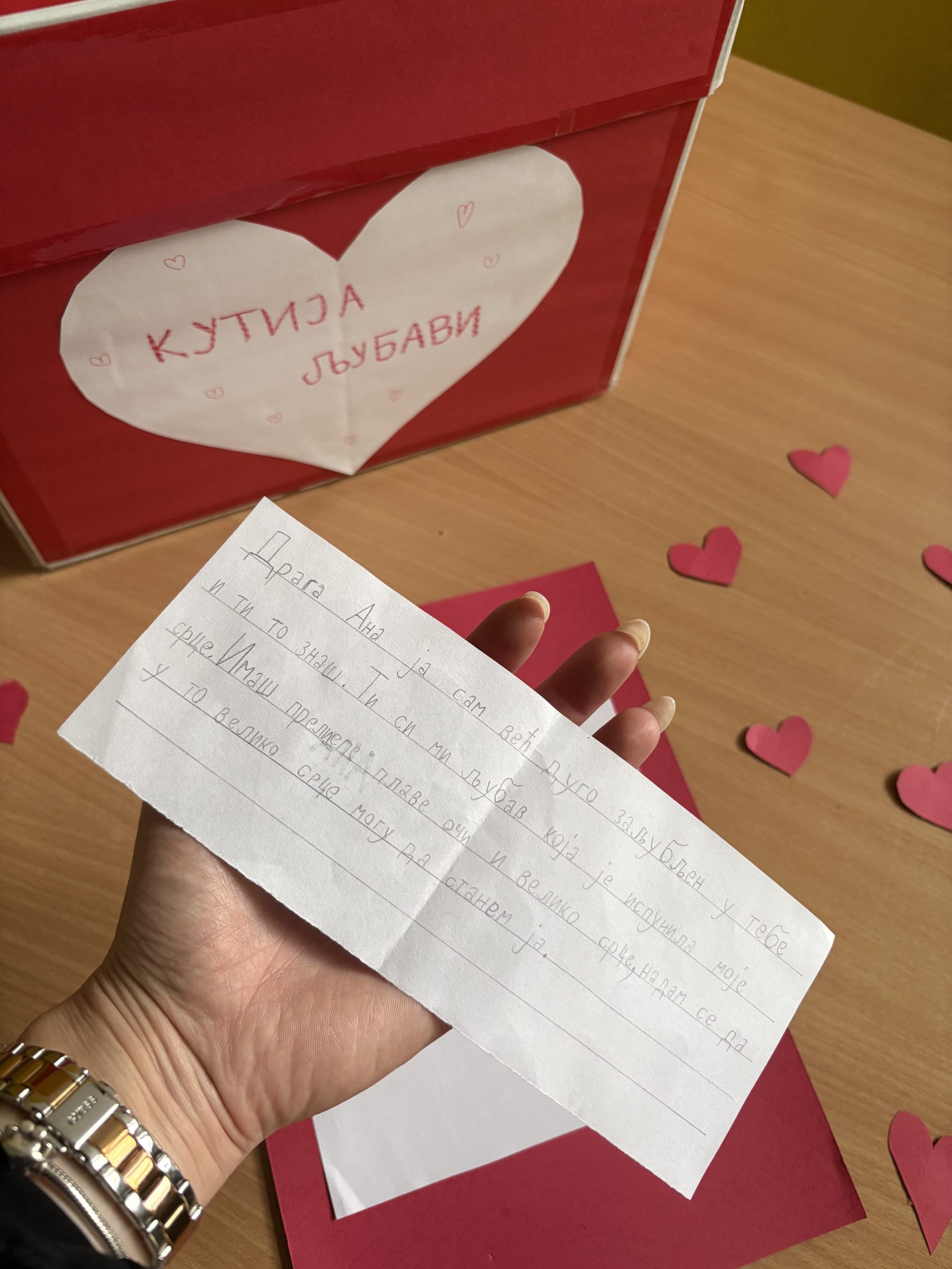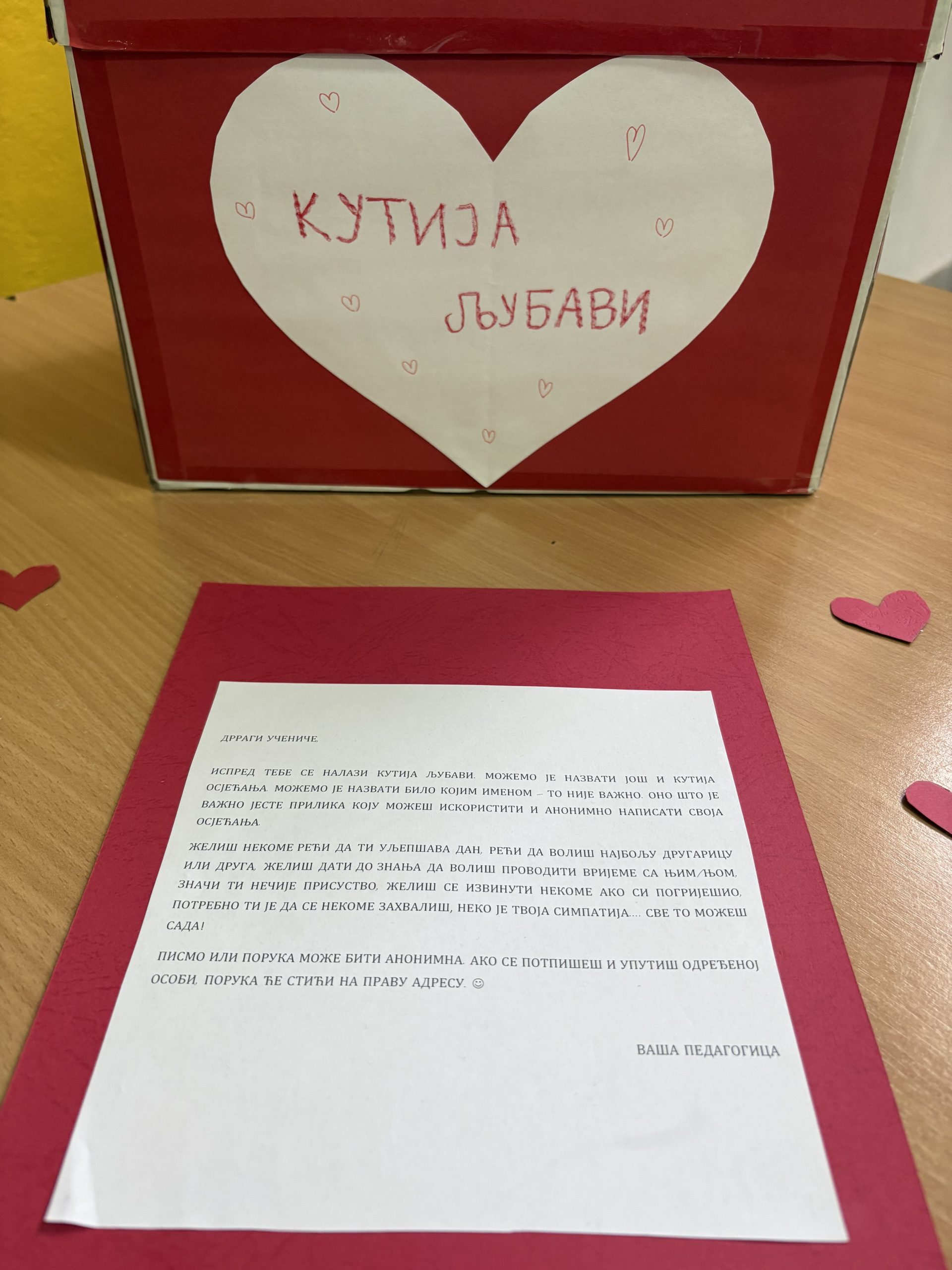 Ових дана у нашој школи љубав је у ваздуху. Не она велика и гласна, већ она тиха – у осмијеху, лијепој ријечи, загрљају и подршци пријатељу. „Кутија љубави/осјећања“ је мјесто гдје ученици могу оставити поруку захвалности, пријатељства, охрабрења или лијепу мисао некоме ко им значи. Јер љубав није само ријеч – она је пажња, доброта и емпатија коју дијелимо сваки дан. Нека наша школа буде мјесто гдје се одјећања његују, а лијепе ријечи шире као најљепши поклон.